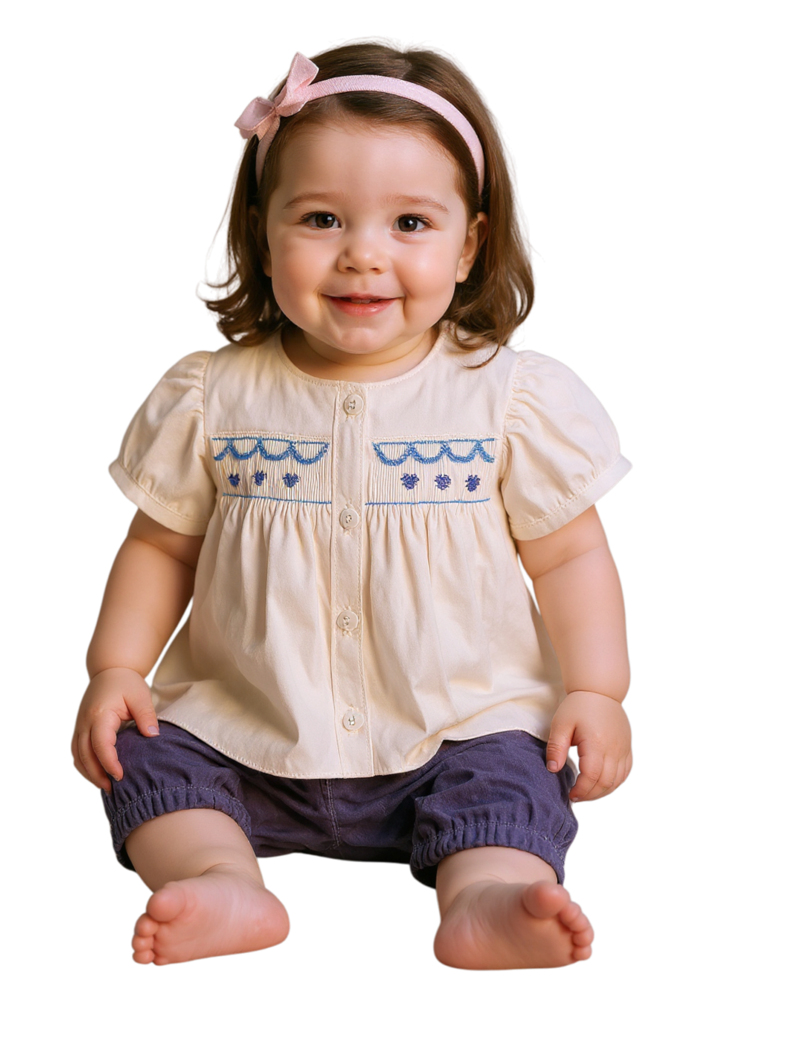 - Artisanal Smocking: The cream-colored top features a beautiful hand-smocked chest panel with delicate blue wave patterns and embroidered floral accents.