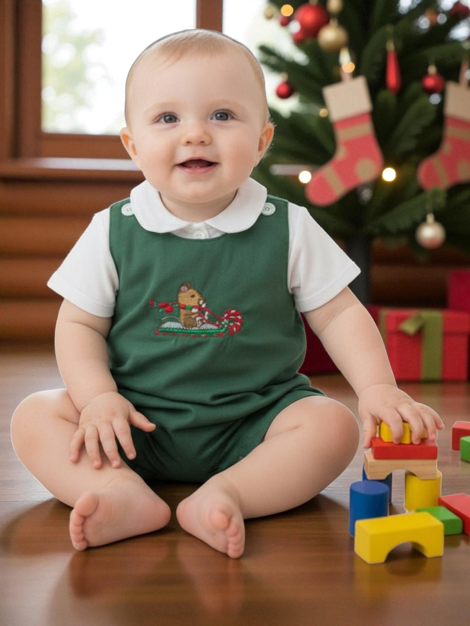 - Whimsical Holiday Embroidery: The center of the deep green Jon Jon features a delightful, hand-styled embroidery of a cheerful mouse navigating a candy cane sled, adding a touch of storybook magic to the holiday season.
