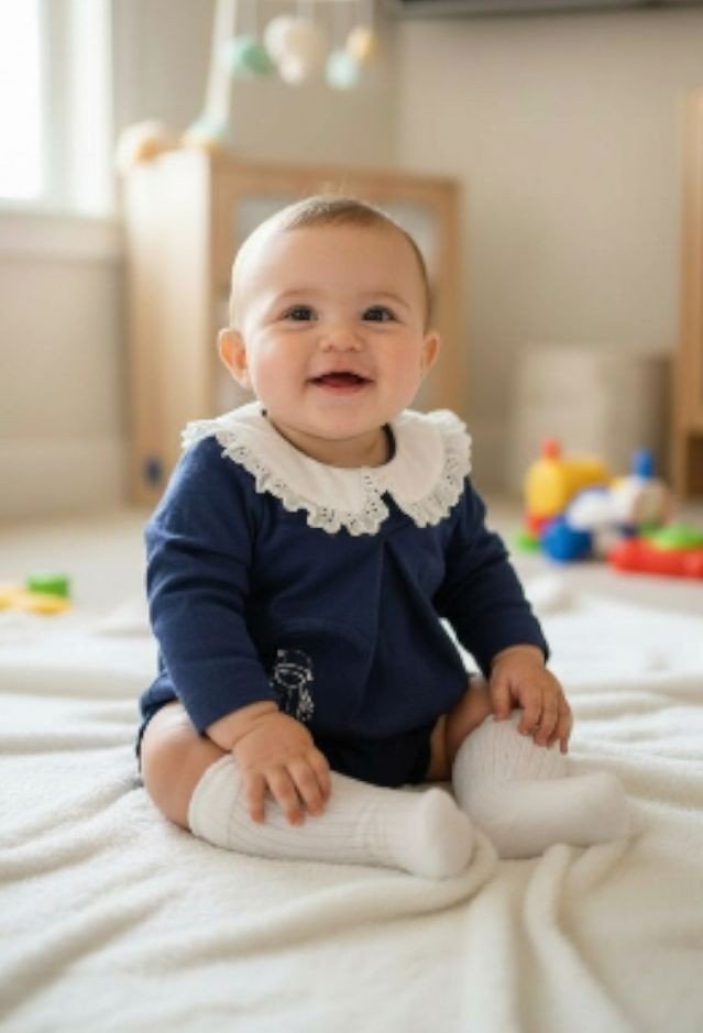 Style Tip: This deep navy romper stands out beautifully in professional portraits, especially when paired with white knee-high socks as seen on our little model.