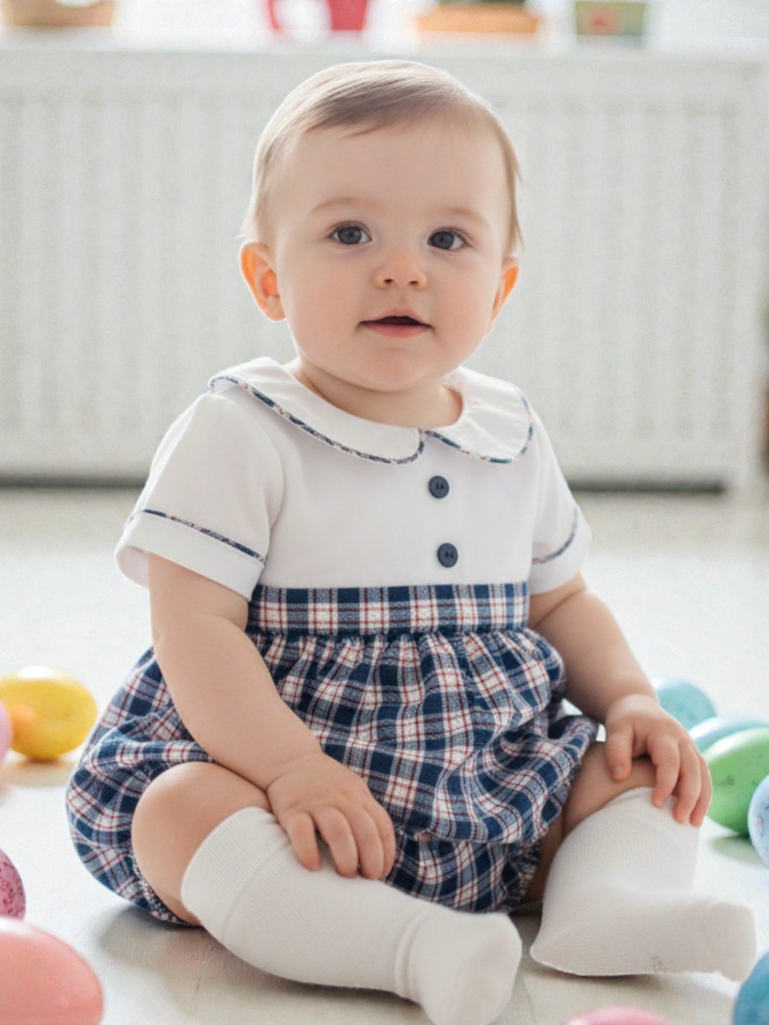 Dress him in a look that’s as classic as it is comfortable with our Navy & Red Plaid Bubble Suit. This timeless one-piece combines a crisp, polished upper with a playful plaid bottom, making it a standout choice for family gatherings, seasonal celebrations, or holiday photos.