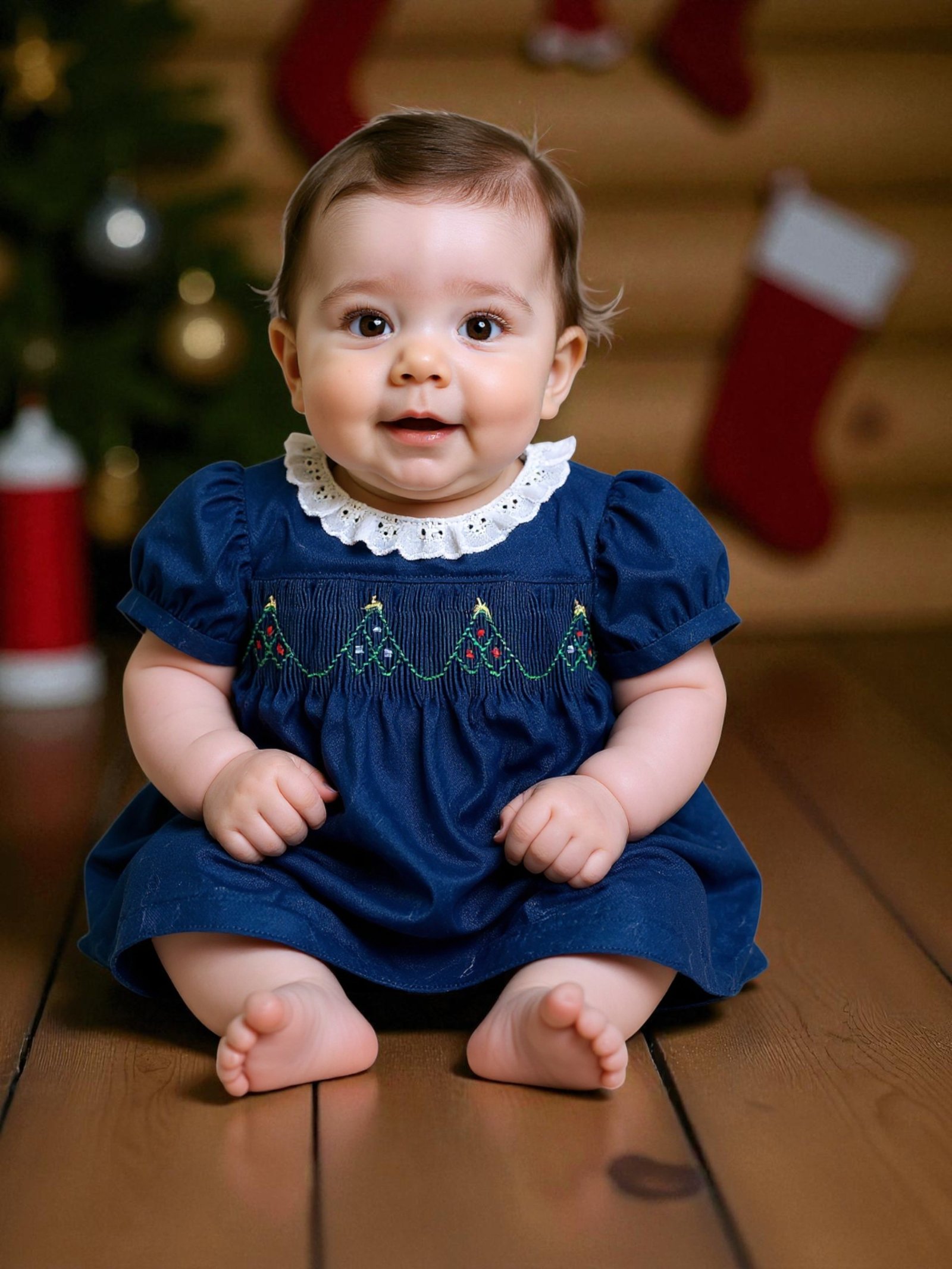 Capture the magic of the holiday season with our Navy Christmas Tree Smocked Dress. This darling ensemble blends deep, classic tones with whimsical hand-detailed embroidery, making it a picture-perfect choice for tree lightings, holiday parties, or Christmas morning photos.